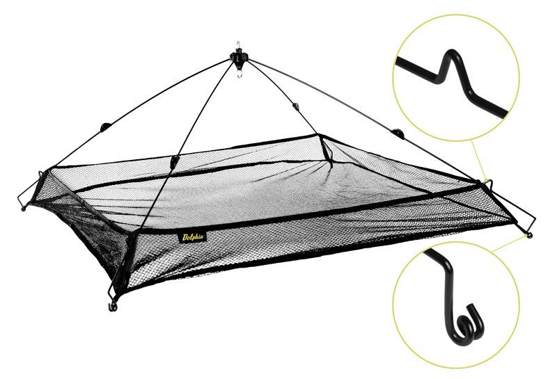 Čeřeň od značky Delphin má řadu nepřekonatelných výhod. První je výborná skladnost a transportní velikost, další je použití nylonu namísto obyčejné síťky, který zaručuje, že čeřeň nebude páchnout rybami ani po častém používání. Kovová ramena jsou výklopná, což zajišťuje opravdu rychlou montáž na lovném místě. Z vrchní části je umístěn kroužek, určený pro připevnění rukojeti s háčkem (není součástí balení). V neposlední řadě překvapí i výborná cena tohoto špičkového čeřenu! Více informací